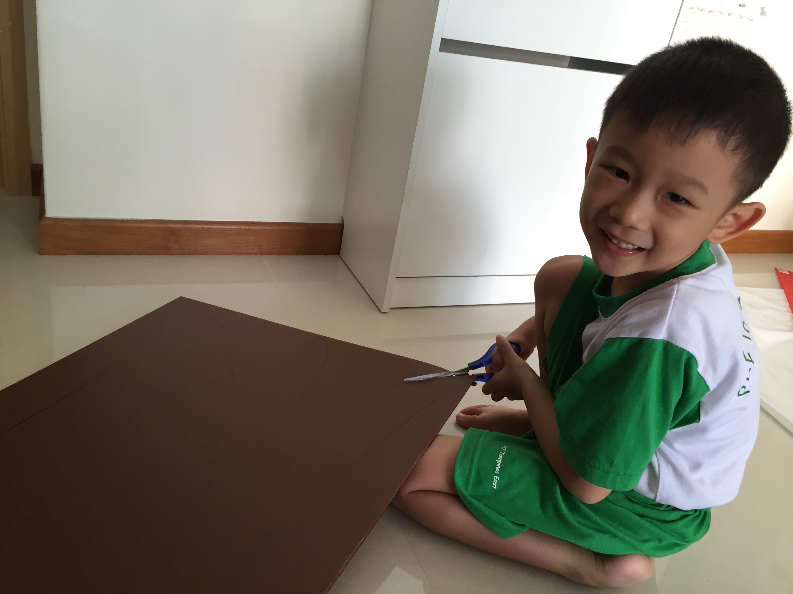 It’s not easy for Em to cut the corrugated board but Mrs Eio is well pleased with his effort.