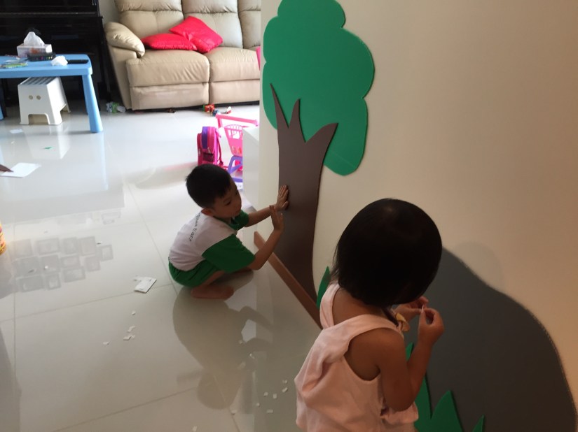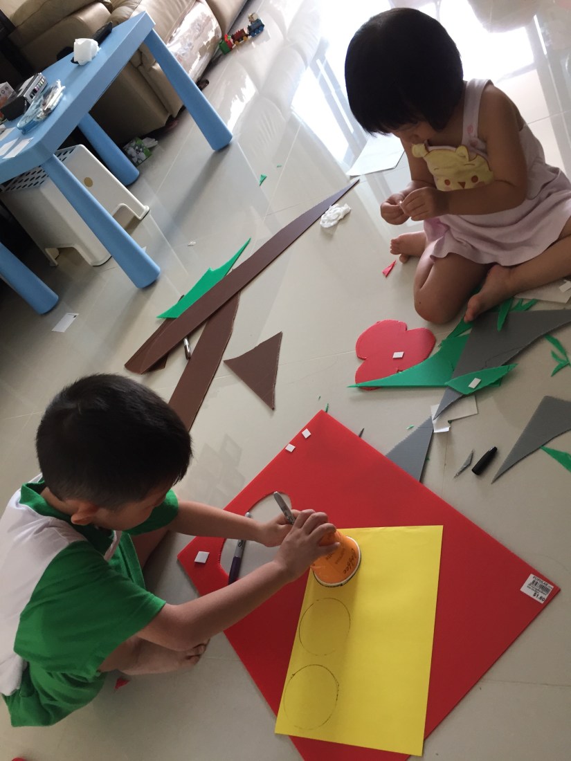 Just when we thought we are done, Mrs Eio & Eio Kids decided to add some flowers. Em’s in charge of using a cup to draw circles & cutting them out. Mrs Eio maximises El’s gifting to peel double sided tape. 😁