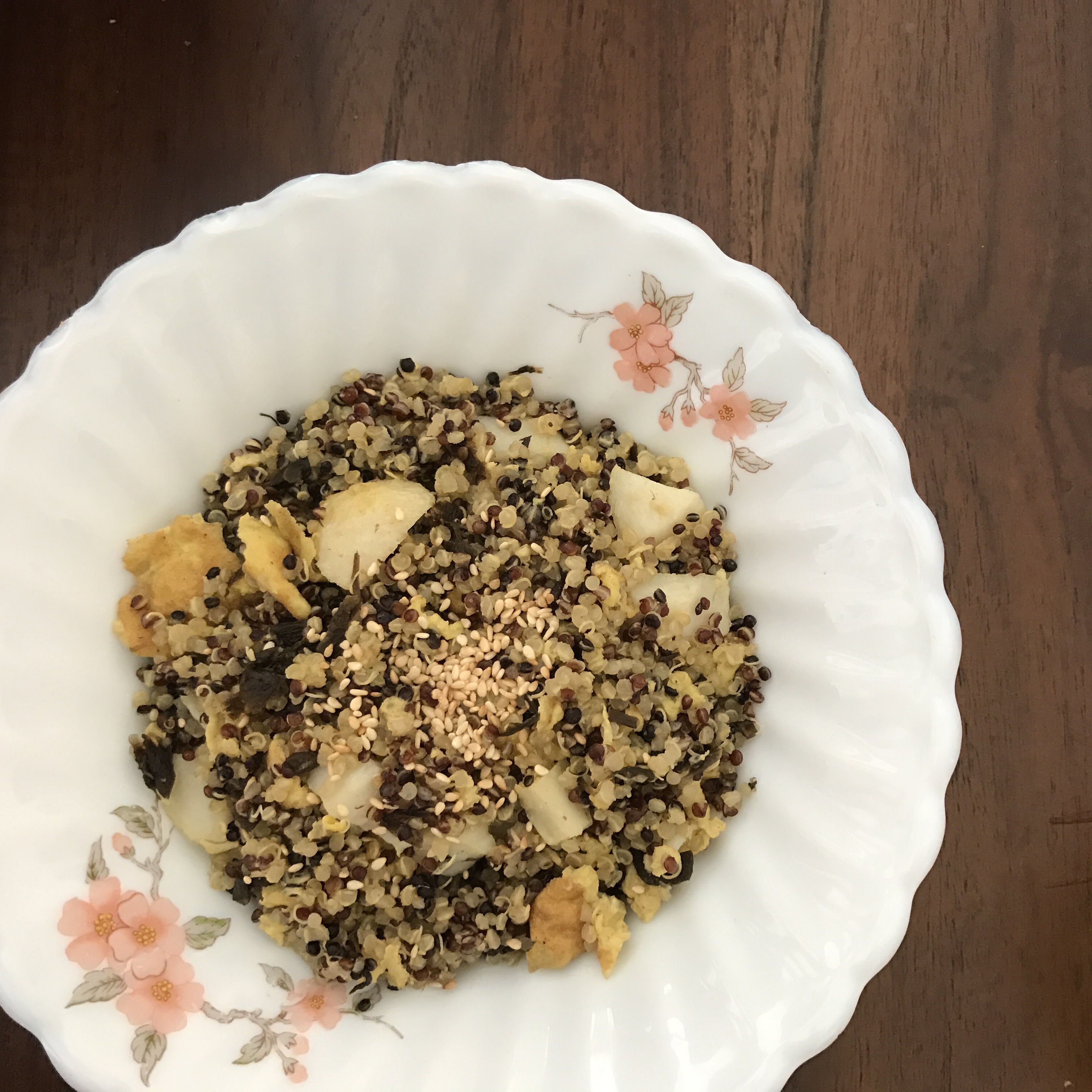 三色小小米,百吃不腻!Fried organic tri-color quinoa with olive veg, eggs & fish cake.