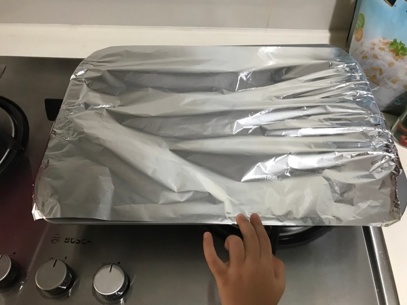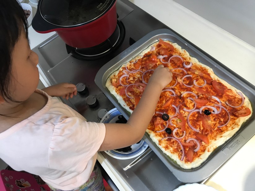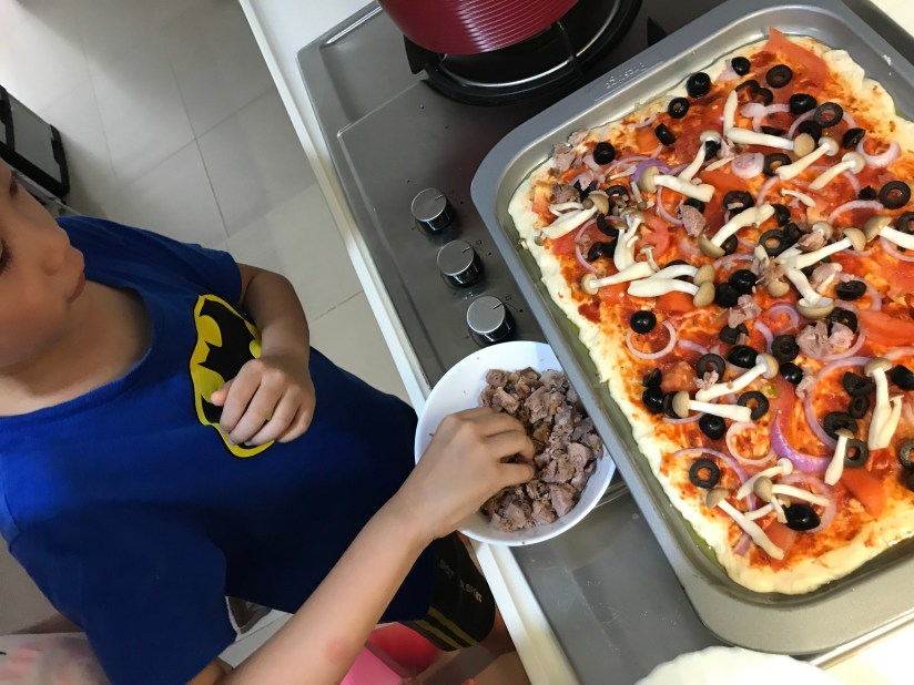 Well, Mrs a Eio’s little kitchen helpers are back in action again. Adding the toppings! This is the fun part! Meanwhile, preheat the over to 200 degreeC.