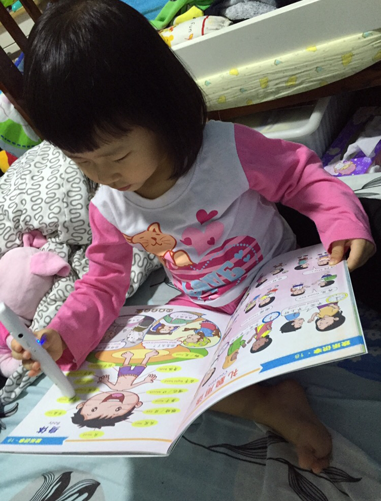 Em learning to pronounce the words after the reading pen.