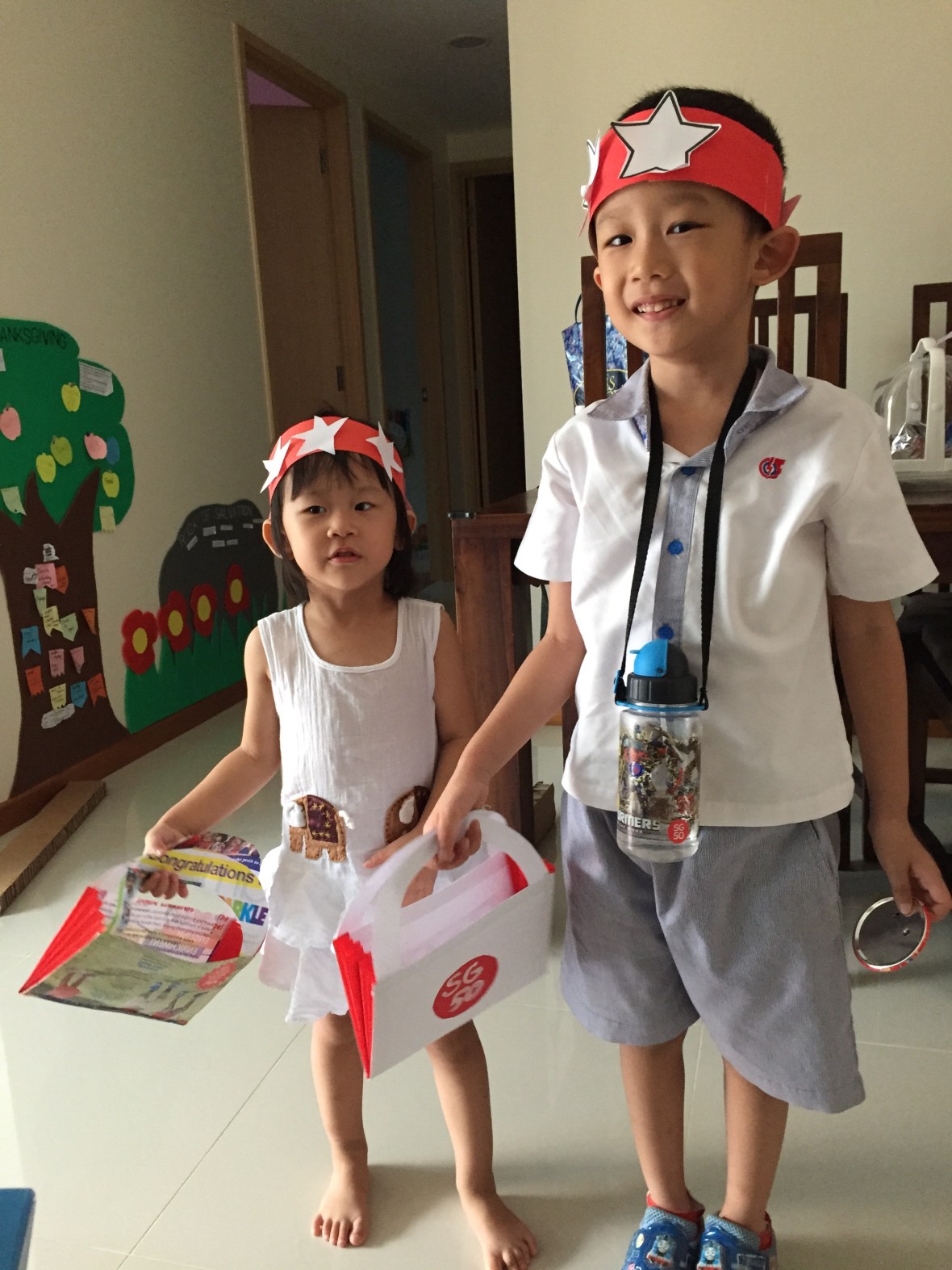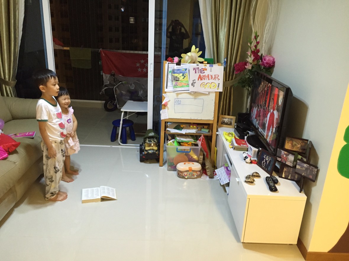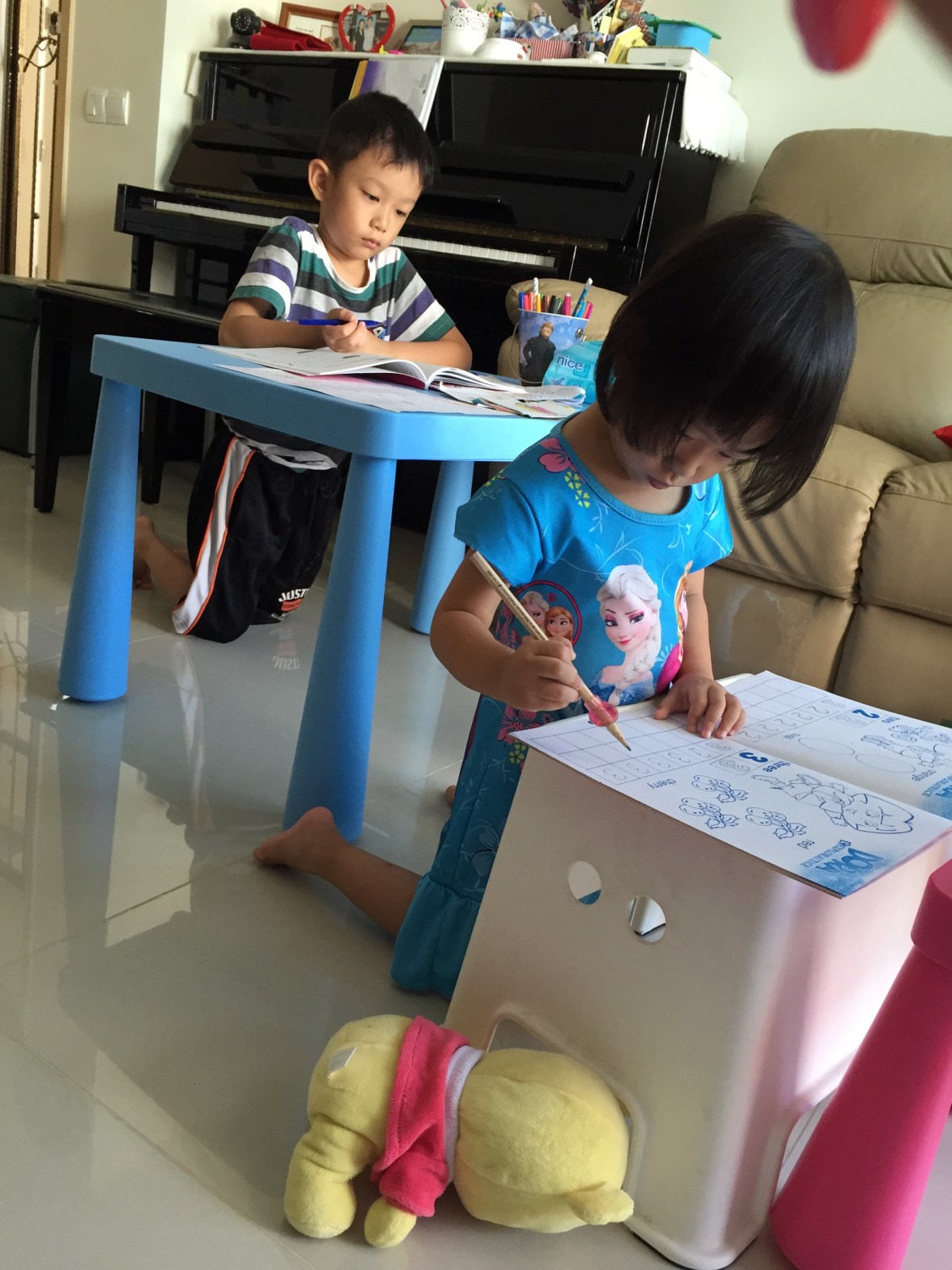 3) Set up a work station (at least a table & chair) so that the kids know where to go automatically to complete their assignments or school homework. (Mrs Eio is still trying to refine this after Em goes Pri school. Probably a more conducive corner in a room… For the time being, Eio kids enjoys doing work at their windy front balcony.)