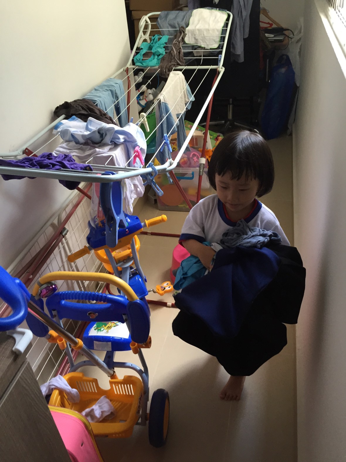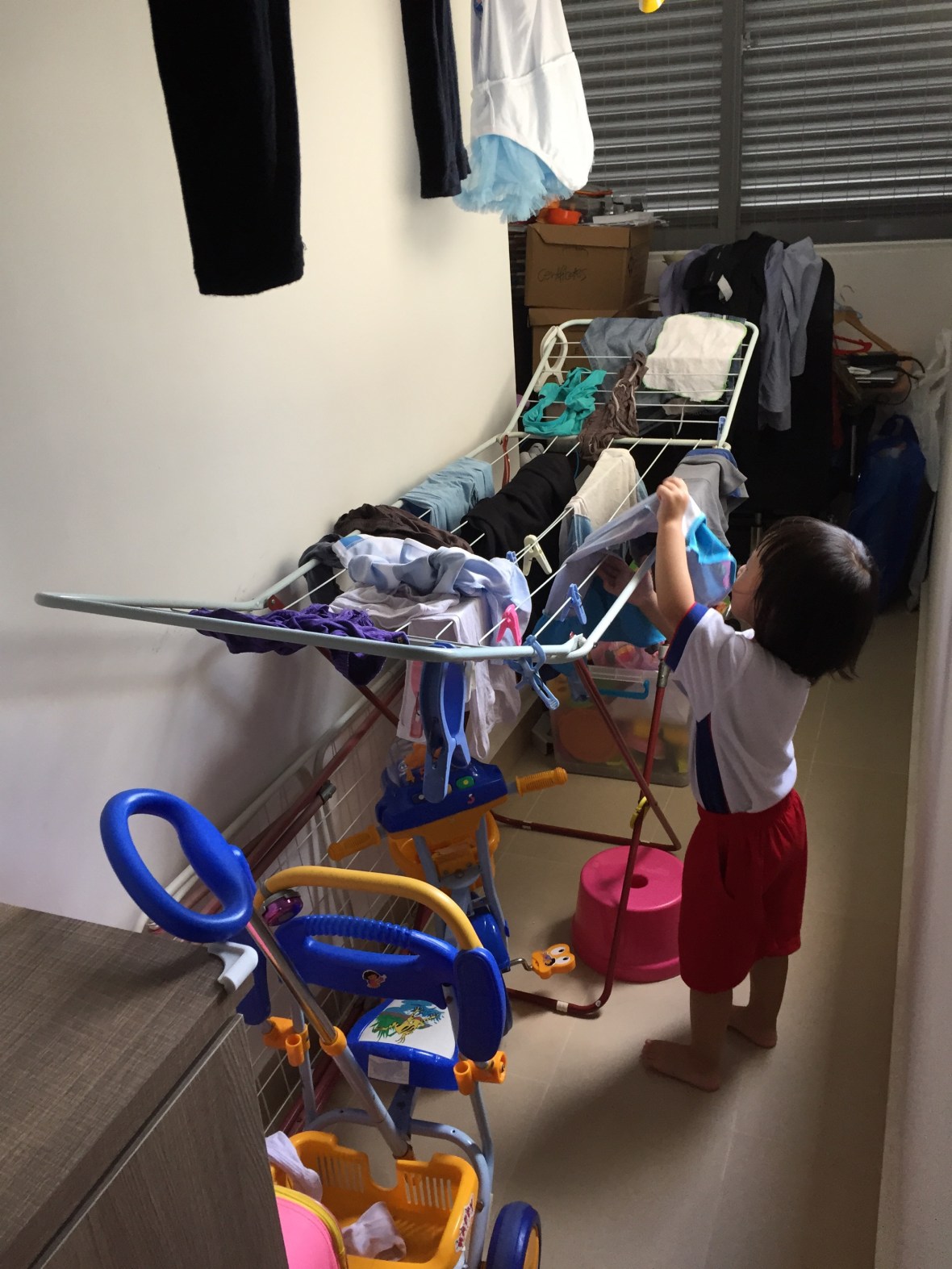 2) Install/ Set up a lower laundry rack so that the kids can help to keep & sun clothes