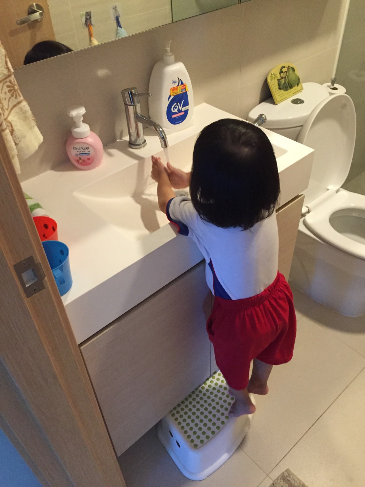 1) Place a stable stool at the sink for them to stand wash hands on their own.