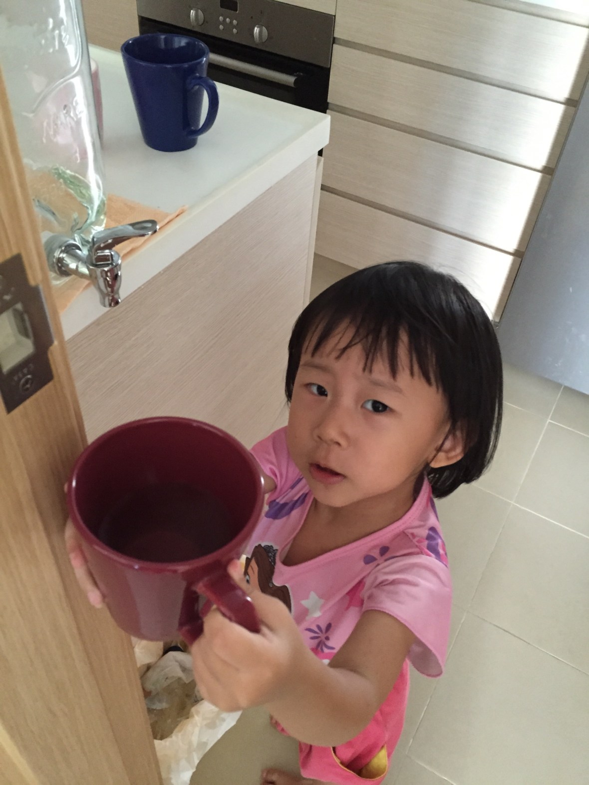 Eio kids tell Mrs Eio that they can wash their own cup after use when Mrs Eio asks them to place the cups at the sink for her to wash.