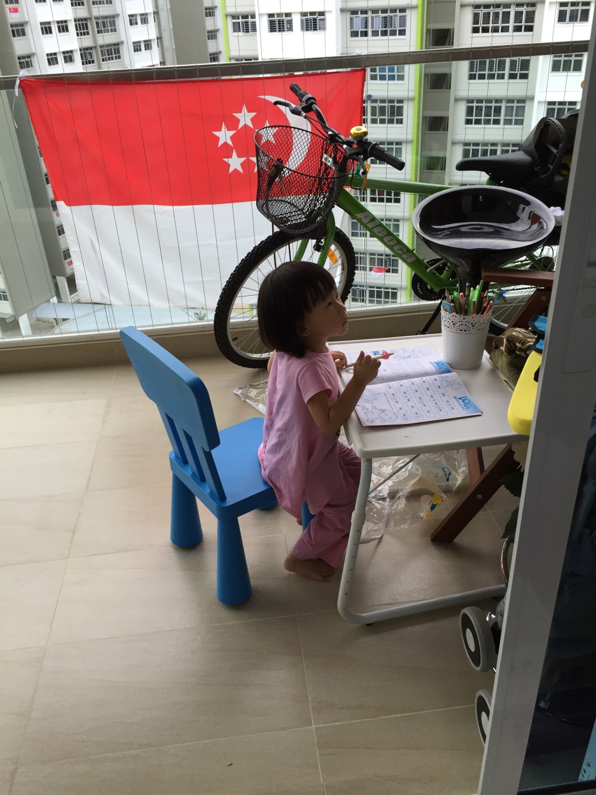 3) Set up a work station (at least a table & chair) so that the kids know where to go automatically to complete their assignments or school homework. (Mrs Eio is still trying to refine this after Em goes Pri school. Probably a more conducive corner in a room… For the time being, Eio kids enjoys doing work at their windy front balcony.)