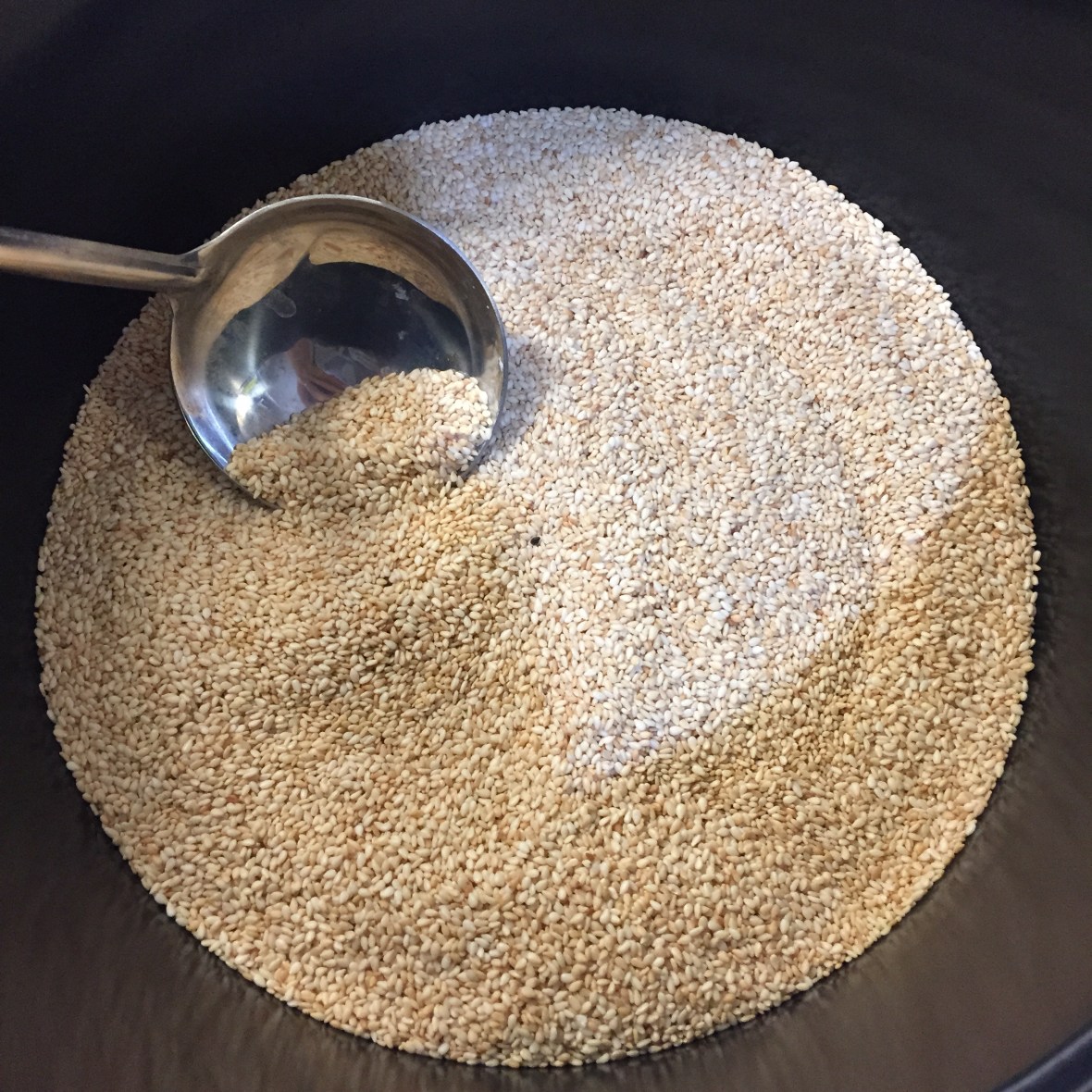 Firstly, Mrs Eio roasted the roasted white sesame seed.