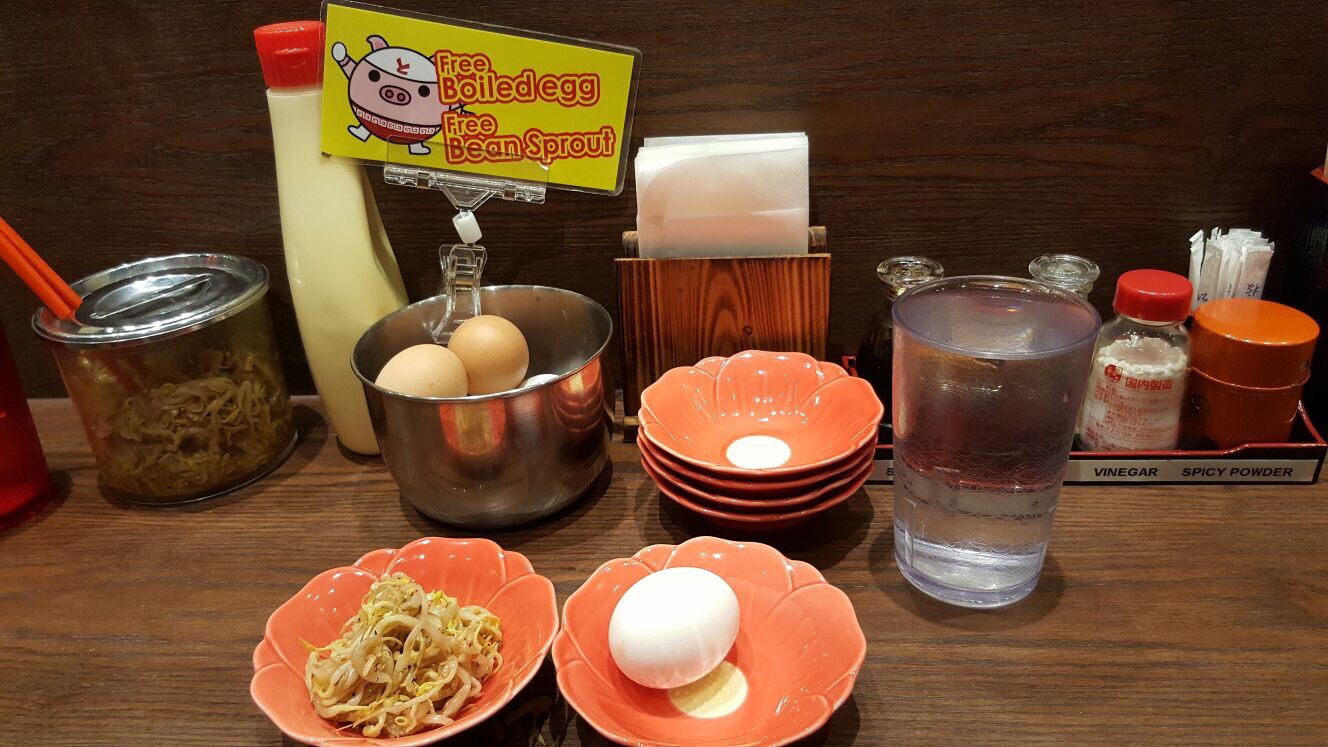 The couple got counter seats.  The restaurant offers free boiled eggs & bean sprout. 👍