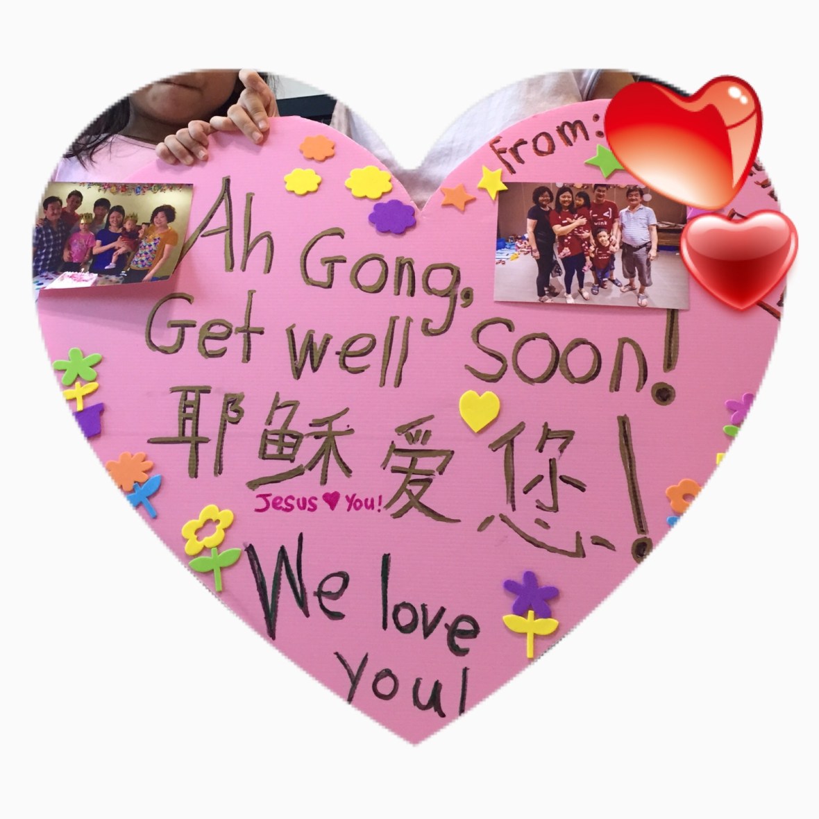 以下是孩子们为家翁(孩子们的祖父)所制作的大卡片。这已经贴在医院病房好几周了。希望他早日康复,能记得他们(孩子们)是谁。多数的字是凯宝贝写的!