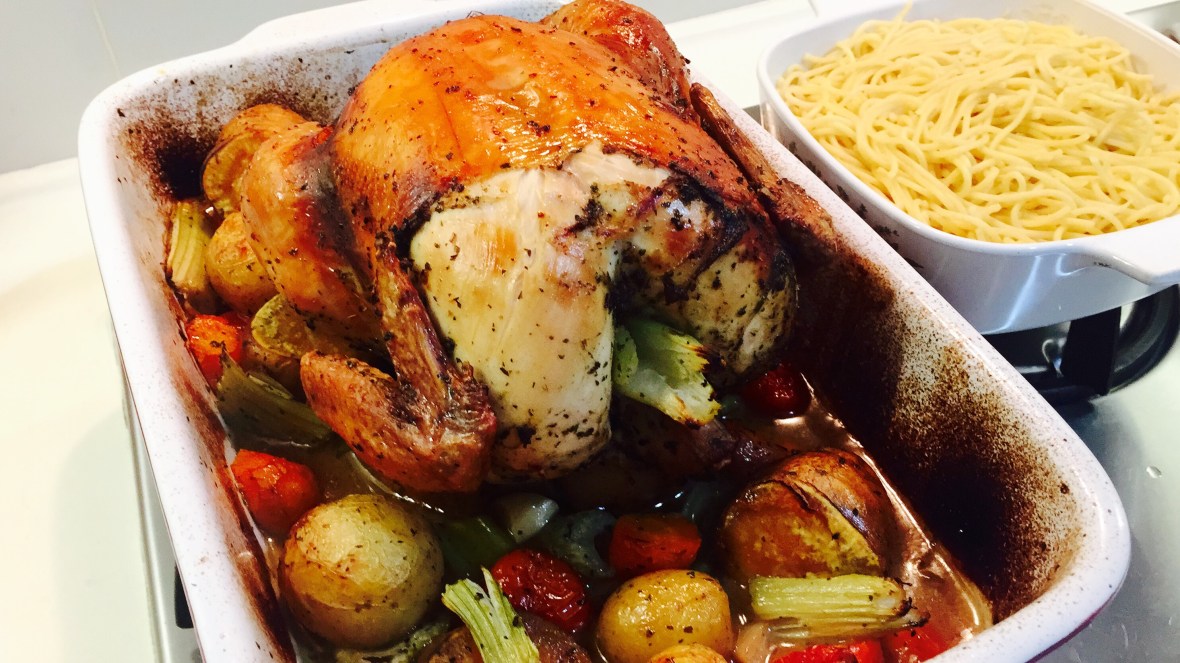 Roast herbal chicken (stuffed with lemon & garlic) & vegetables