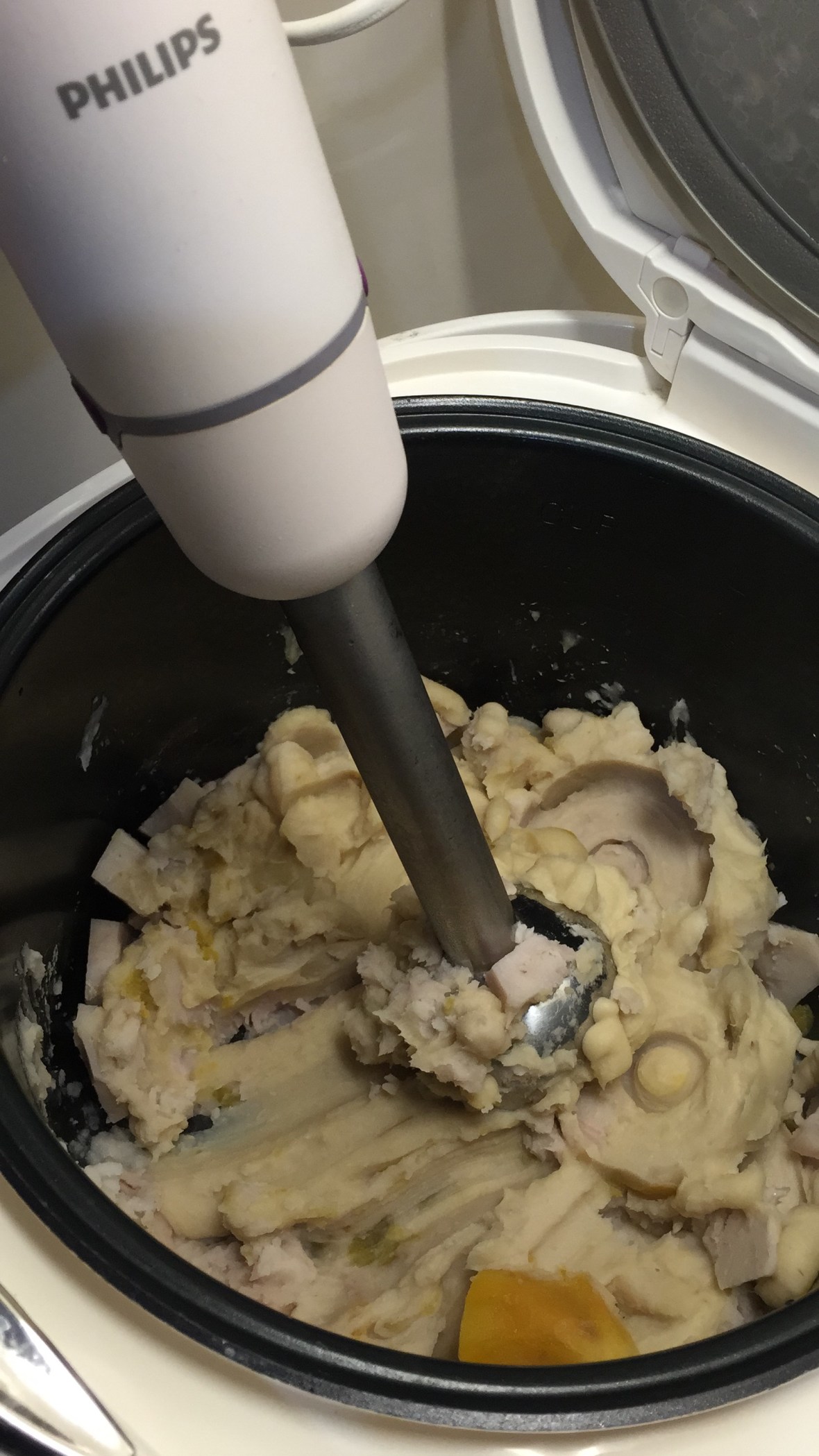 4. The yam & sweet potato is done after about 15-20 minutes. Mrs Eio off the rice cooker & let it cool for about 5 min. She prefers to blend the yam & sweet potatoes with her handheld blender so the texture is smoother (instead of mashing them).