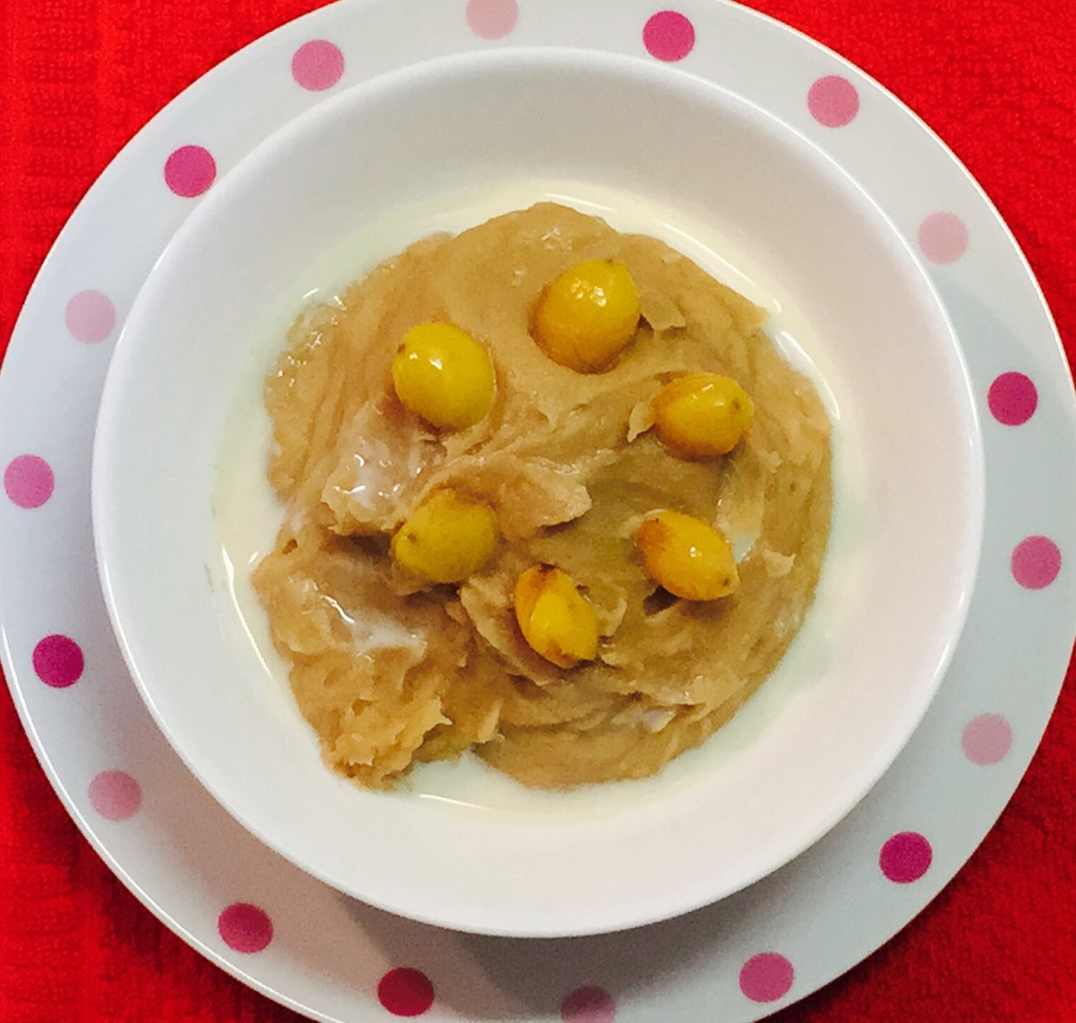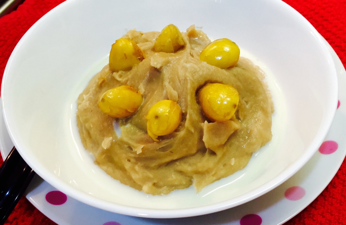 8. Serve the yam paste in a bowl while it’s still warm. Add in the gingko nuts & additional soy milk. (Some people prefer to drizzle coconut cream instead before serving.)