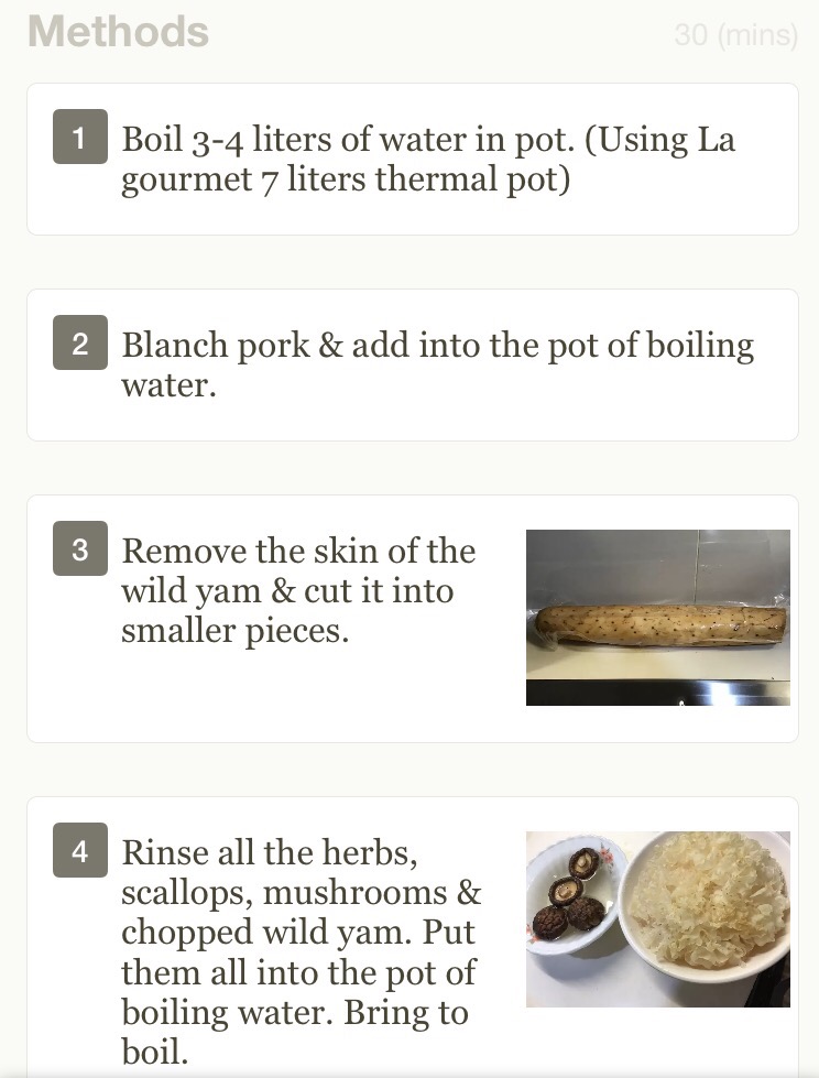 Here’s the recipe for wild yam & white fungus soup. Mrs Eio posted this recipe on another platform. So she’ll just take screemshots of what she has posted. 😊