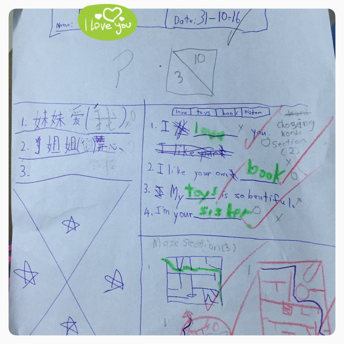 Lo & behold… after Em goes to primary one & sits for tests after tests… he came to Mrs Eio with a test script one evening & said El failed the test!!! Mrs Eio wondered what happened?!?!! Em set a test paper for El & guide her to complete the questions. For goodness sake! If El can do all these questions correctly, Mrs Eio will sure progress her from pre-school to primary one!! Haha.
